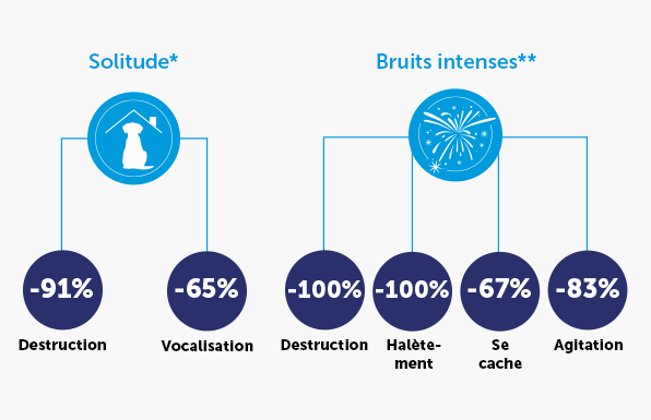 Une autre étude** a montré qu'ADAPTIL Calm aide à réduire les destructions et l'halètement de 100%, l'agitation de 83% et le besoin accru de se cacher de 67% chez les chiens stressés par les feux d'artifice.