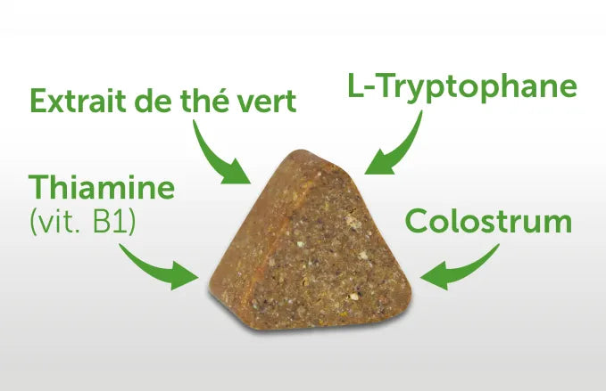 ADAPTIL Chew doit son efficacité et sa rapidité d'action à son complexe apaisant d'origine naturelle. Composé de 4 ingrédients dotés de propriétés apaisantes scientifiquement démontrées, il agit à plusieurs niveaux de la réponse émotionnelle :