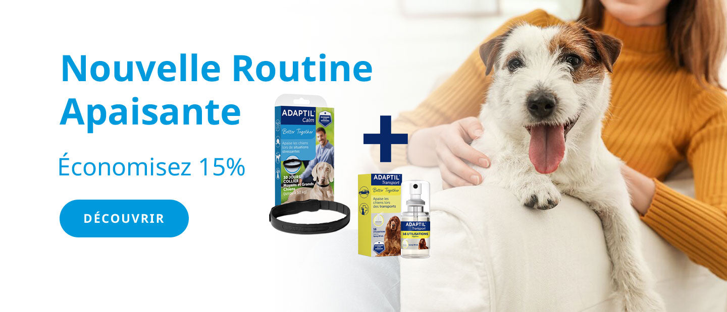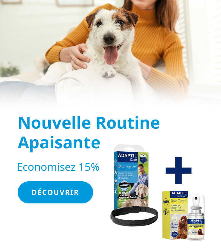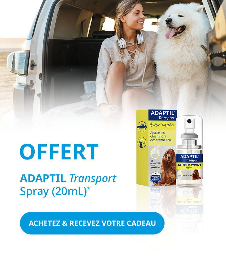 *Un spray ADAPTIL Transport offert dès 2 produits achetés. Aucune alternative en espèces. L’offre est soumise à la disponibilité des stocks et peut être retirée à tout moment. Offre valable du 16/02/2026 au 09/03/2026. Offre non cumulable avec d’autres réductions ou promotions. Le produit s'ajoute automatiquement lorsque le nombre des produits du panier est supérieur ou égal à deux produits. Valable une seule fois par client.