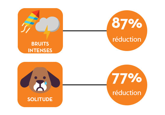 Procure un sentiment de détente et de sérénité en cas de difficultés à rester seul ou lors de bruits intenses. comme les orages ou les feux d'artifice.